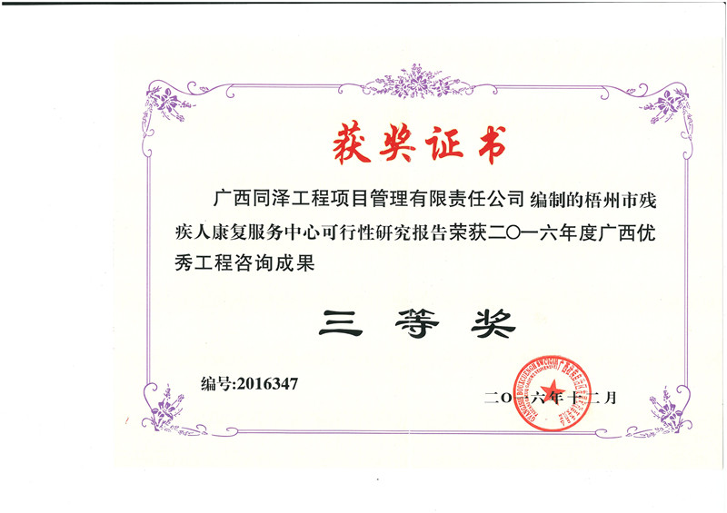 梧州市殘疾人康復(fù)服務(wù)中心可行性研究報(bào)告榮獲2016年度廣西優(yōu)秀工程咨詢成果三等獎(jiǎng)