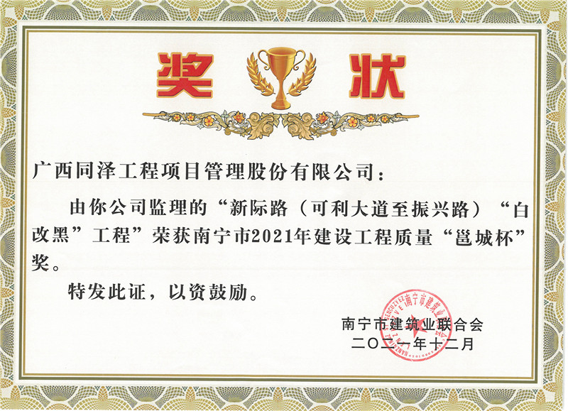 新際路(可利大道至振興路)“白改黑”工程榮獲南寧市2021年建設(shè)工程質(zhì)量“邕城杯”獎(jiǎng)