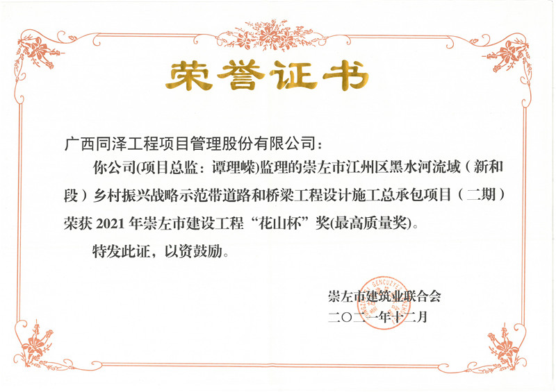崇左市江州區(qū)黑水河流域(新和段)鄉(xiāng)村振興戰(zhàn)略示范帶道路和橋梁工程設(shè)計(jì)施工總承包項(xiàng)目(二期)項(xiàng)目榮獲2021年崇左市建設(shè)工程“花山杯”獎(jiǎng)(最高質(zhì)量獎(jiǎng))